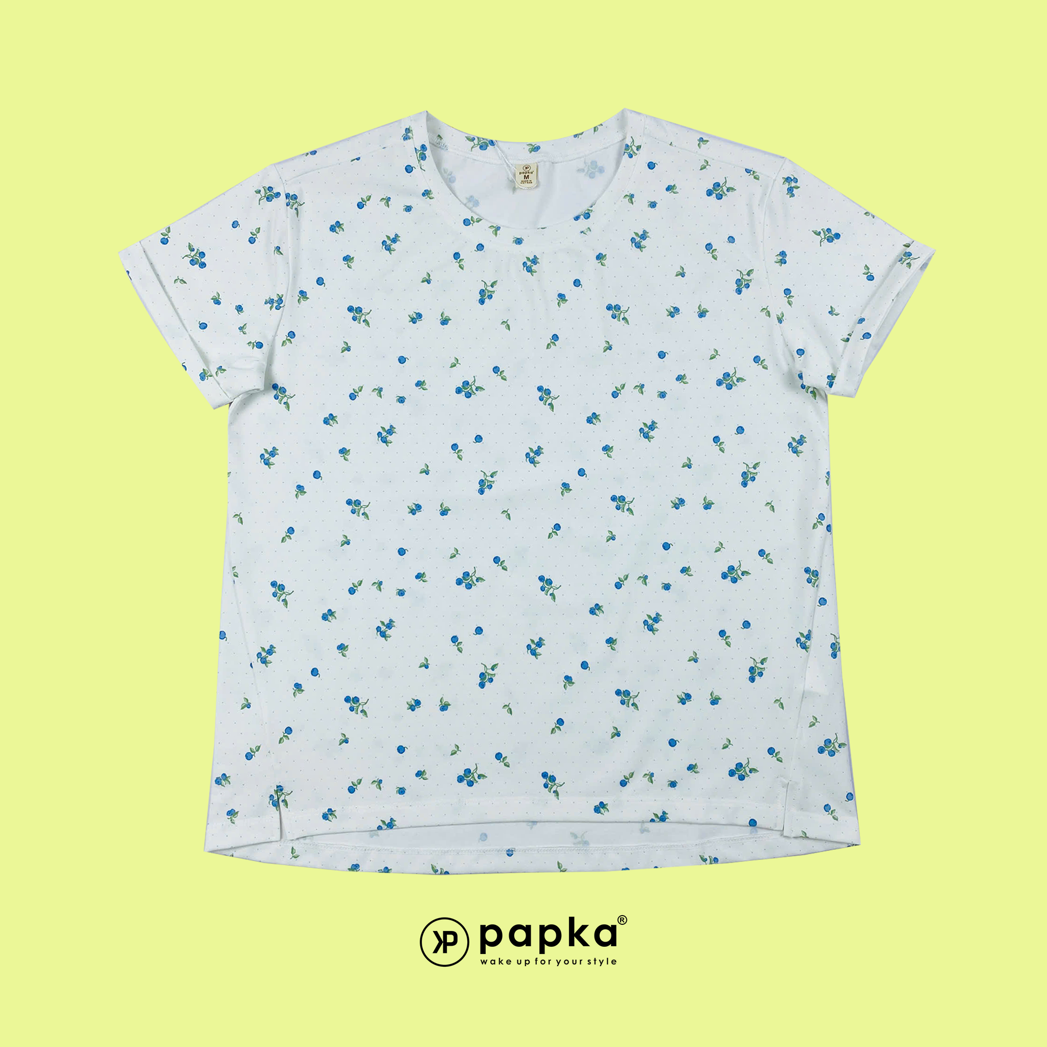 Áo thun nữ Papka 3031 màu trắng họa tiết hoa nhí màu xanh xẻ tà vạt ngắn trước sau mang vẻ trẻ trung thoải mái